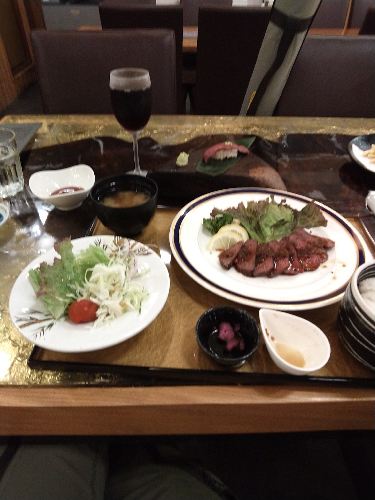 伊東駅で途中下車し駅前の寿司店に入る。やたらと寿司以外のメニューが充実している謎の店だ。寿司店に入っておいてなんだが魚より肉の気分だったので、鹿肉定食を頂いた。